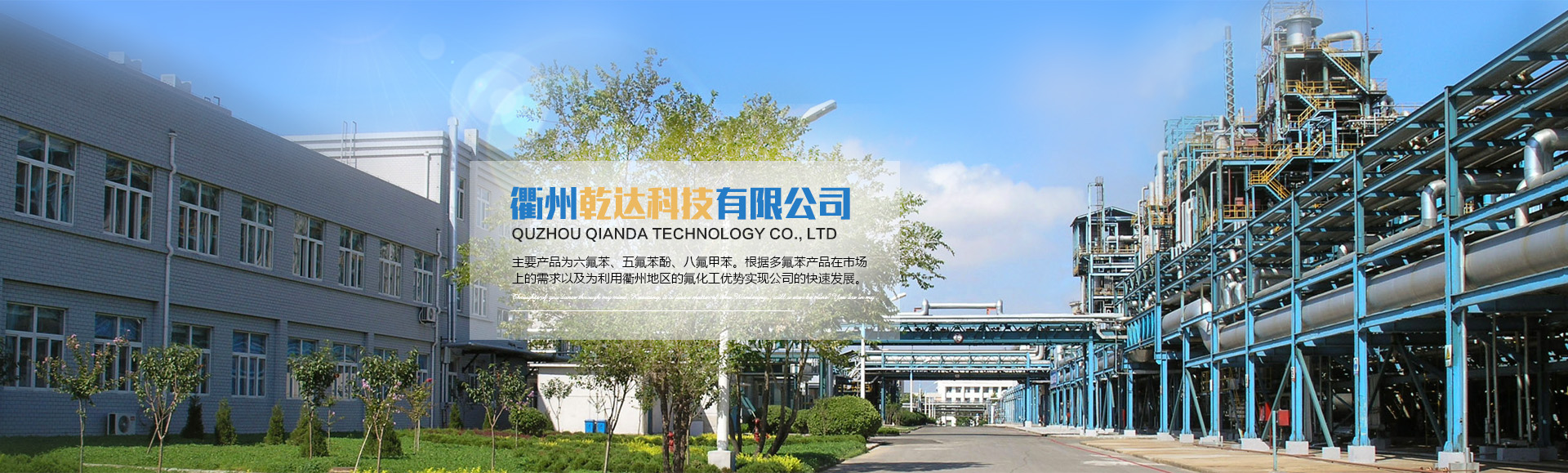 衢州乾達(dá)科技有限公司成立于2013年8月,注冊(cè)地浙江省衢州市柯城區(qū)華楓路16號(hào),位于衢州市高新技術(shù)產(chǎn)業(yè)園。公司運(yùn)用國(guó)內(nèi)首創(chuàng)工藝進(jìn)行多氟苯及其衍生物的研發(fā)并實(shí)現(xiàn)了工業(yè)化量產(chǎn)。